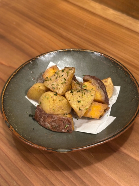一度素揚げした北あかり(ジャガイモ)とじっくり蒸した安納芋を揚げてアンチョビバターで。