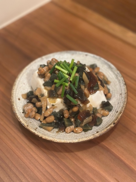 ピータン×納豆の曲者同士をホルモン煮込みに使う自家製のニンニク醤油ダレで和えました。