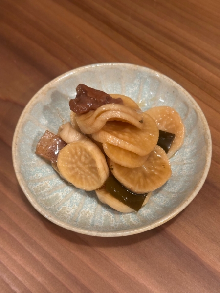 干し大根を夫婦切りで切ってスルメや昆布、梅干しを入れて醤油と酢とザラメを煮溶かした物に漬けます。