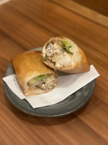 新玉ネギ 2026-03-03 13:56:50 仙台 いろは横丁の居酒屋あらじるです。2026/3/3 17時スタート本日は新玉ネギを使った春巻き松前漬のように漬けた新玉ネギと鰻、ウルイ、2種のチーズで巻き巻き今回はパリパリ感アップと食べた〜と思えるように皮を2枚に。実山椒と胡椒の塩漬けのアクセントもいい感じです。本日も御来店お待ちしております。080-9632-1404 居酒屋あらじる