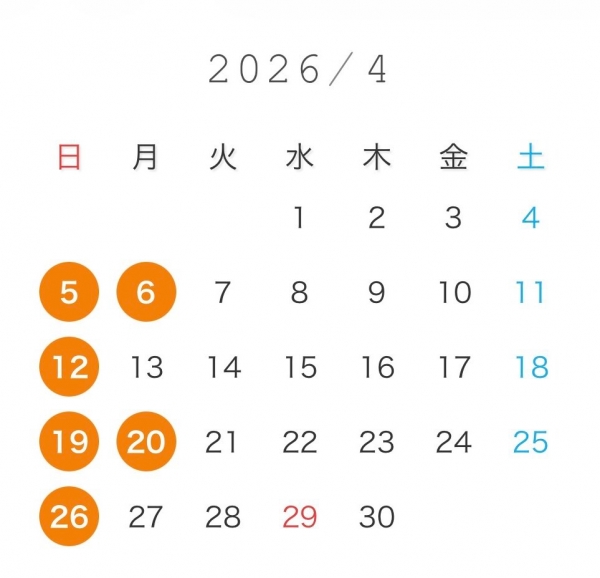 2026/4月の定休日 2026-04-01 11:29:54 仙台 いろは横丁の居酒屋あらじるです。2026/4/1 17時スタート本日は4月の定休日のお知らせオレンジ色の丸が定休日となります。GW辺りは予約時間が重なる事がありますのでお早めに御予約頂けるとありがたいです。GWの5/5,6はお休みの予定です。本日も御来店お待ちしております。080-9632-1404 仙台市青葉区一番町2-3-28居酒屋あらじる